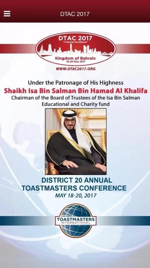 Konferensi Tahunan Kabupaten 20 Toastmasters dijadwalkan akan diselenggarakan dari 18-20 Mei 2017 Teluk Hotel Convention Center di bawah Binaan HH Sheikh Isa Bin Salman Bin Hamad Al Khalifa, Ketua Dewan Pembina Isa Bin Salman Pendidikan & Dana amal.