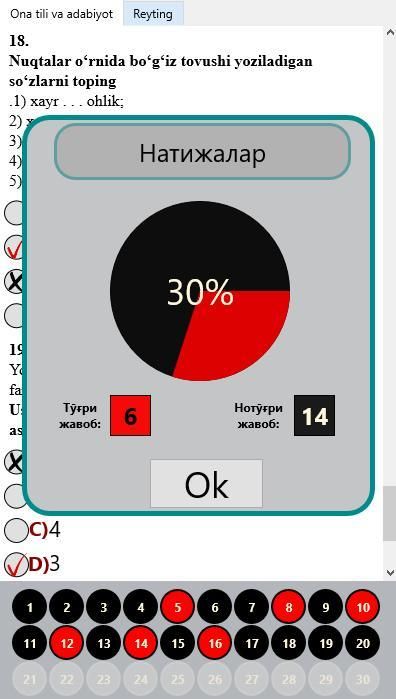 Dawlat Uji Markazi (DTM) - uji sinovlari. Ushba Dastur orқali PPE ӯz bilimingizni Sinang wa Oliy ӯқuv yurtlariga Kirish uchun tayorlaning. Dasturda Barcza fanlardan namunalar keltirilgan bӯlib savollar miқdorini tanlash zhavoblar shakllarini kӯrsatish imkoniyatlari yaratilgan. Shuningdek Peringkat Sistemas ӯrnatilgan bӯlib, sizning bilimingiz sistem Ushba orқali kuzatib boriladi.Topshiriқlarni қanchalik yahshi zhavob bersangiz Peringkat kӯrsatgichi shunchalik Baland bӯladi. Ishonamizki Ushba dasturimiz Aziz muhlislarimizga zhuda ҳam maқul Kelada wa Albatta biz dusturga yangi yangi savollar қӯshish va uni takomillashtirish ishlarini boramiz Olib Pulau yaқin vaқtlarda dasturimizni Yanada ҳam foydali bӯlishi uchun ҳarakat қilamiz.