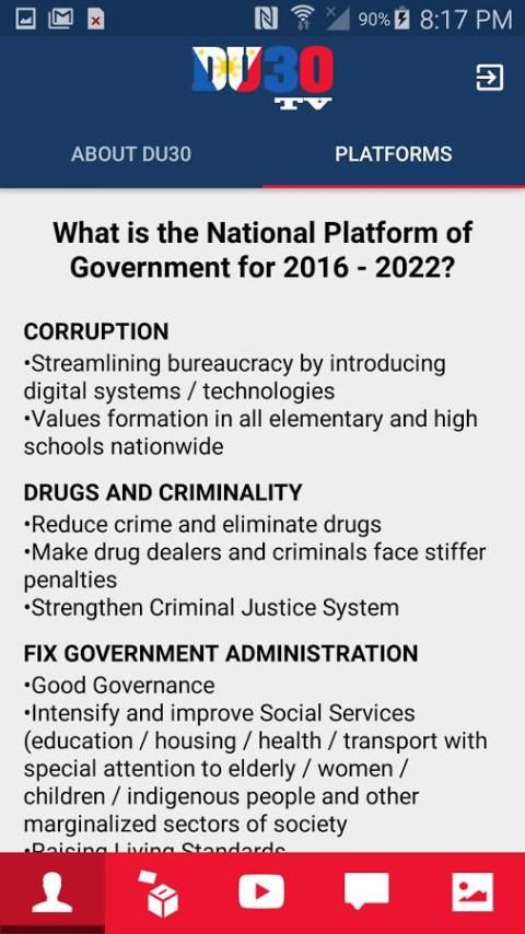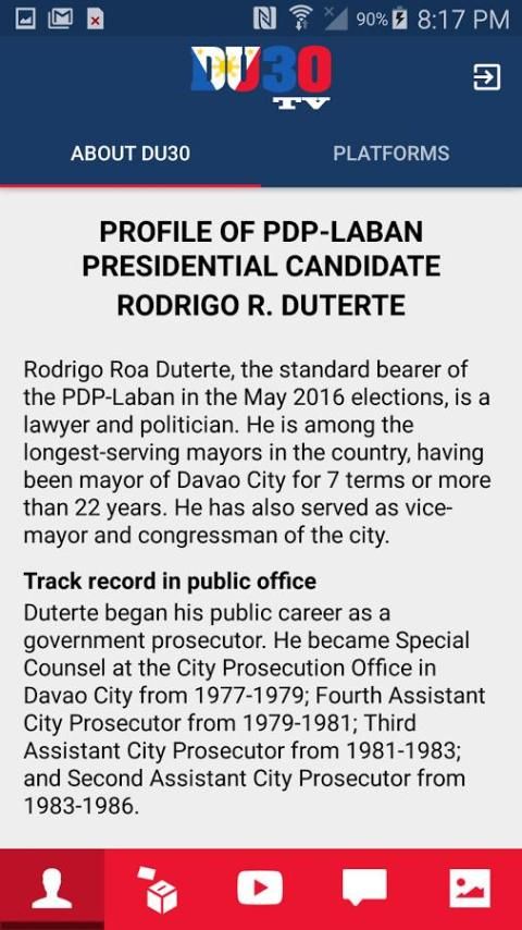 The Du30 TV aplikasi berisi informasi tentang 2016 calon Filipina Presiden Walikota Digong Duterte.