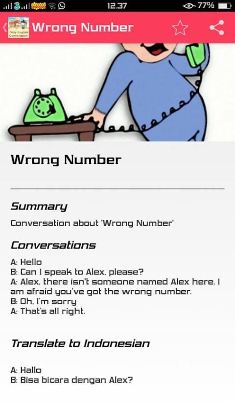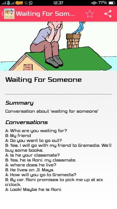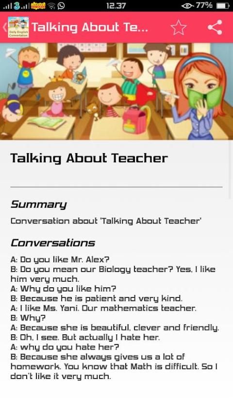 Jika Anda mencari sebuah aplikasi untuk meningkatkan keterampilan berbicara bahasa Inggris dan membantu Anda berbicara bahasa Inggris lebih lancar, aplikasi ini cocok untuk Anda. Aplikasi ini berisi berbagai contoh percakapan bahasa Inggris sehari-hari. Ini akan membantu Anda berbahasa Inggris dengan lancar.