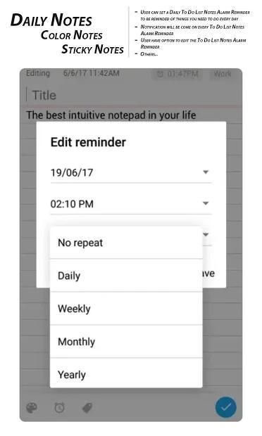 * Memo alarm reminders for your to do list or checklist notes. The notepad alarms of the reminders can be repeated daily, monthly or yearly.