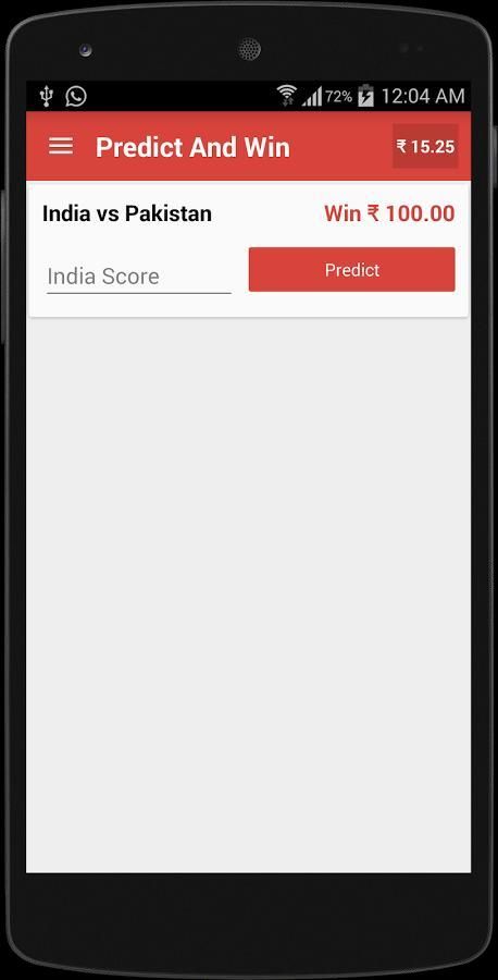 Prediksi dan Dapatkan Bagian di mana Anda dapat memprediksi skor tim 1 memainkan pertandingan kriket pada hari itu dan jika Prediksi Anda Exact kemudian Anda akan menang isi dan mendapatkan 100 Rs. segera.