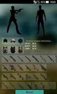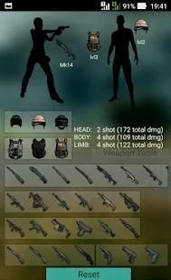 kalkulator menghitung jumlah tembakan senjata untuk mencapai KO musuh. Memperhitungkan berbagai bagian tubuh (kepala, torso, tungkai) dan tingkat armor lawan.