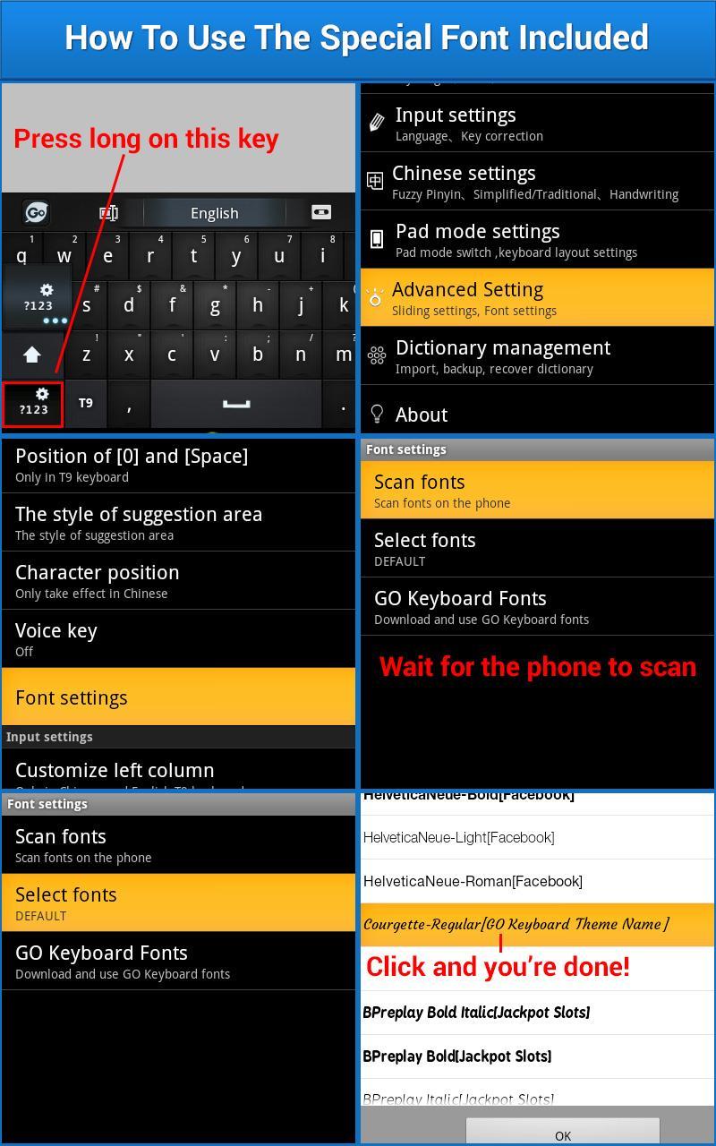 --- To use the custom font included press long '? 123' key, go to 'Advanced Settings',select 'Font settings', then