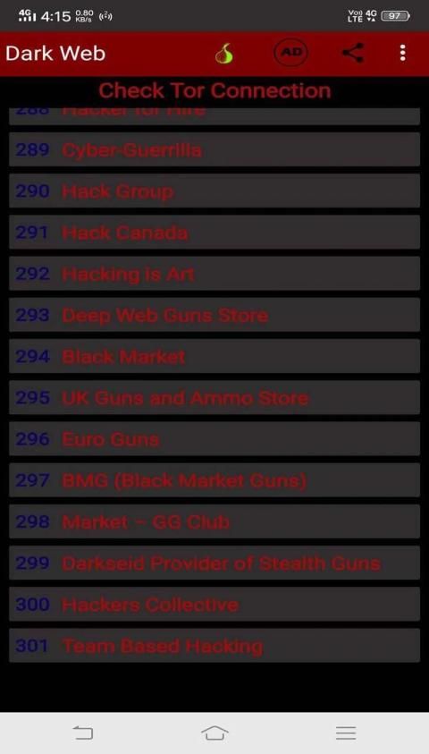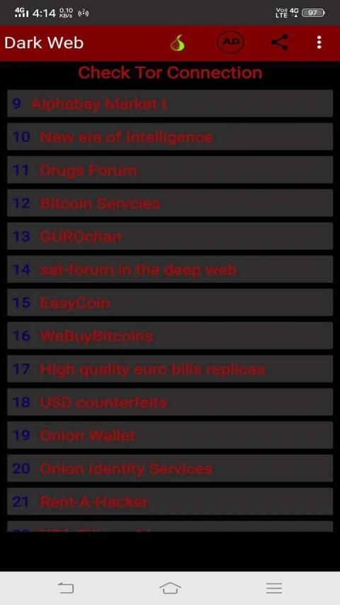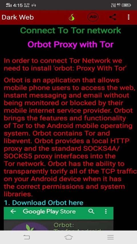Dark web adalah platform Deep dan web dan ini satu-satunya tempat untuk mengakses web gelap dengan sangat mudah dan aman dari Mobile. Aplikasi ini memiliki lebih dari 200 tautan kerja dan lebih banyak lagi yang ditambahkan setiap minggu.