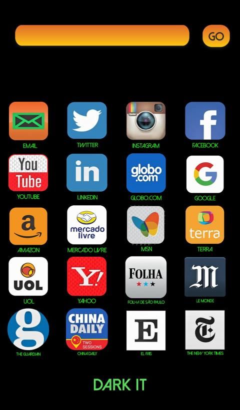 Dark It App changes the color of the most used assets on your mobile: facebook, instagram, twitter, e-mail and internet. The background is switched to black, and the letters are switched to green, orange, blue or red. Concerning the internet, it also works as a navigator that changes the colors of all visited websites.