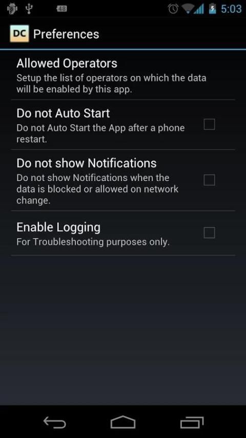 Sebuah aplikasi sederhana yang memungkinkan Anda memutuskan di mana jaringan harus telepon diperbolehkan untuk menggunakan Mobile Data.