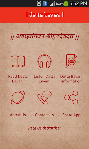 Aplikasi Datt Bavani bertujuan untuk bermanfaat bagi para penyembah Dattatreya.Ini memberikan deskripsi singkat tentang Lord Datta, Datta Bavani dan asalnya.Aplikasi berisi terjemahan asli Gujarati Datta Bavani yang ditulis oleh param pujya shri.ranga Avadhuta Maharaj di devnagari dan bahasa Inggris.
