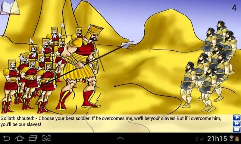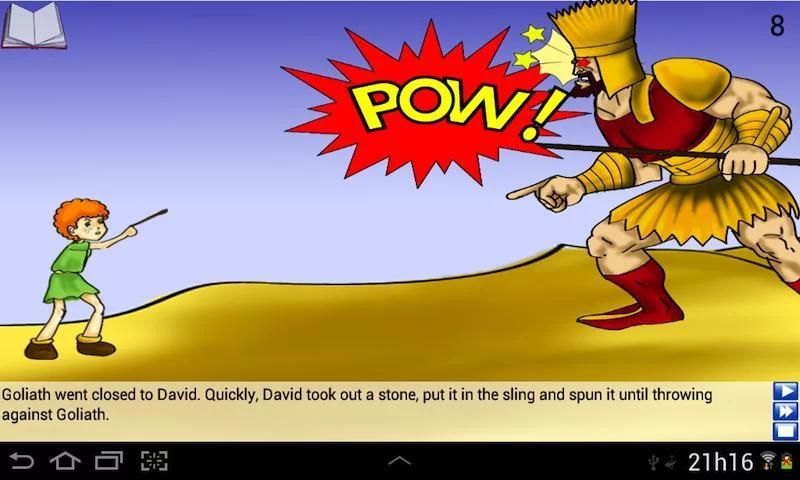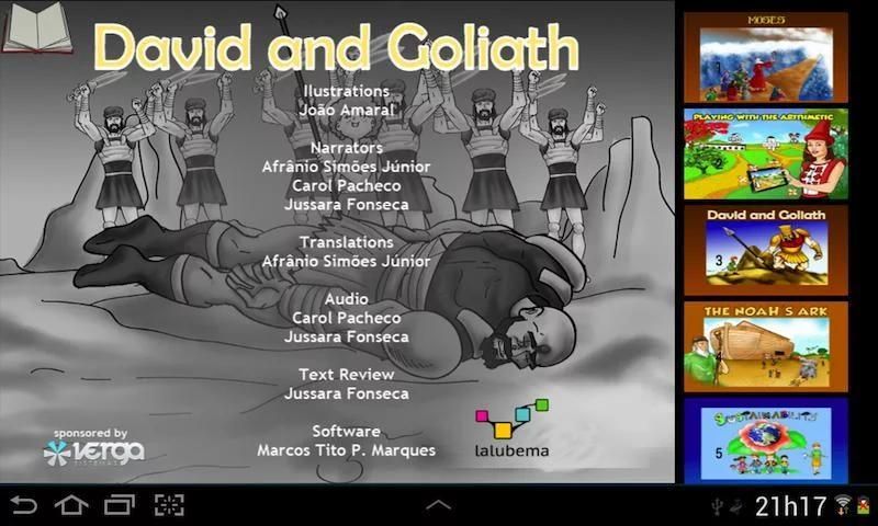 Dengan mencampur animasi dan interaktivitas, kisah David dan Goliath mendorong minat baca dan kreativitas. Anak-anak dapat memindahkan karakter, mendengarkan suara binatang dan juga memilih untuk mengaktifkan account. Interaksi, dan menyenangkan, membantu dalam pengembangan koordinasi motorik dan laterality.