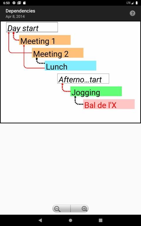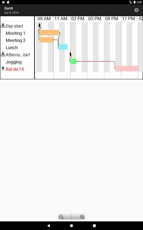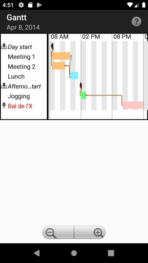 Mengelola setiap hari Anda sebagai sebuah proyek dan membiarkan telepon Anda menghitung perencanaan atau perencanaan tim Anda. Anda telah cukup memasukkan kegiatan yang direncanakan (tugas), ketertiban dan durasi mereka, telepon Anda akan menghitung jadwal Anda dan margin untuk setiap kegiatan dan mungkin menyampaikannya kepada Anda dalam beberapa cara: daftar diurutkan, Gantt chart, dependensi diagram, minggu atau bulan sintesis ...