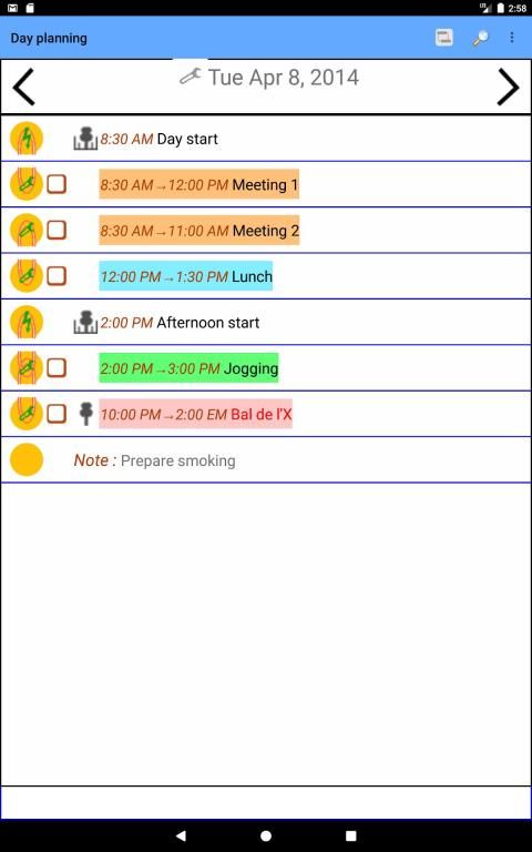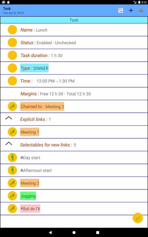 Manage each of your days as a project and let your phone calculate your planning or your team planning. You have simply enter the planned activities (tasks), their order and duration, your phone will calculate your schedule and margins for each activity and may present it to you in several ways: sorted lists, Gantt chart, dependencies diagram, week or month synthesis...