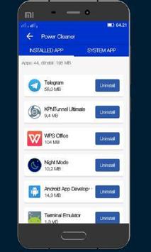 Daya cleaner pembersih Android sederhana dan mudah digunakan untuk membersihkan sampah sampah file pada telepon Anda dan meningkatkan kinerja, menonaktifkan aplikasi yang berjalan di latar belakang dan juga uninstall aplikasi dengan satu sentuhan