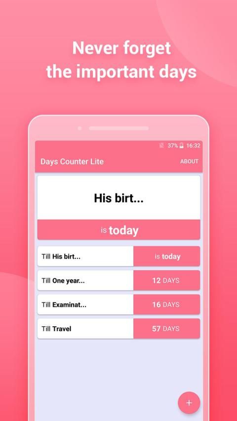 Trendy and lightweight app to track the most important events from your life. View days elapsed after an event or the remaining days. With this app you will never forget about anniversaries, birthdays or any memorable events. Maybe you want to find out your age in days, weeks or years? Maybe you want to know how long have you been free from smoking? In the middle of a nofap or exercise challenge? No problem at all. This app will tell you that and much more!