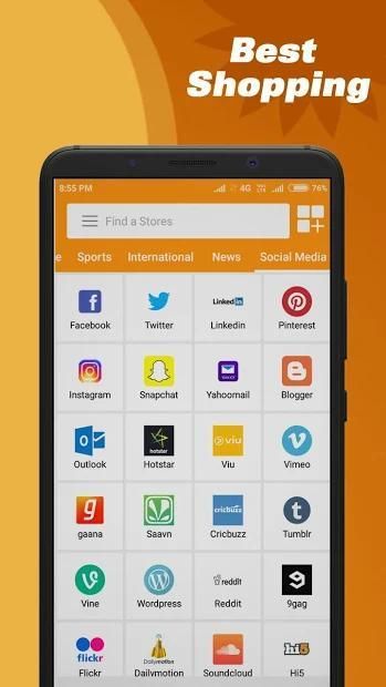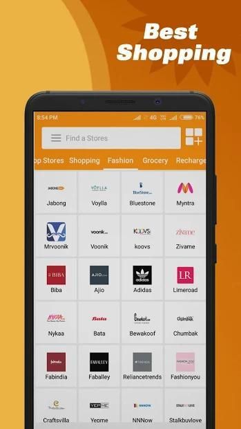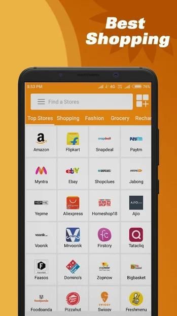 It contains a portion of the extremely famous applications like - YepMe, Shopclues, Amazon, Myntra,Flipkart, Paytm, Snapdeal, AliExpress, eBay India, Craftvilla, Infibeam, Naaptol, AJIO, Voonik, Cardekho, MakeMyTrip, Jabong, Couppnraja, zomato, biba, firstcry, bookmyshow, bigbaasket, Mcdonalds, pizza hut, KFC, quiker, olx.