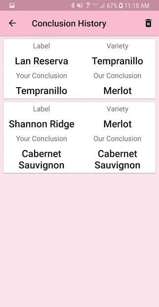 Simpan catatan sejarah mencicipi Anda! Simpan hasil tebakan Anda dan berbagai anggur yang sebenarnya terungkap untuk ditinjau nanti. Aplikasi ini juga akan mencoba untuk menebak berbagai jenis anggur berdasarkan masukan karakteristik anggur Anda sendiri!