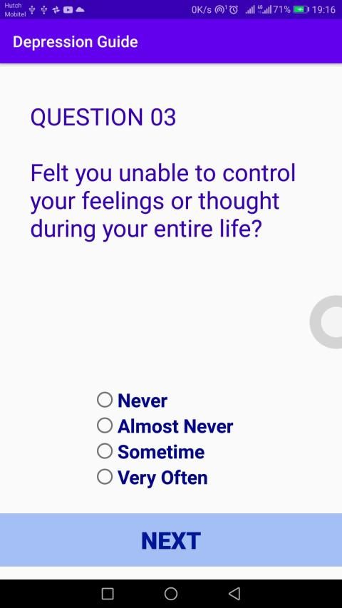 Through this test give a vast education about the importance of life.Many people in the world are in big deal with the mind.There are many ups and downs in life and they struggle with their own minds in life's problems.So we hope that this assessment and information will be beneficial to those who are experiencing such stressful and depressive situations.Depression Guide- helps to alleviate your depression and keep your mental well-being intact.