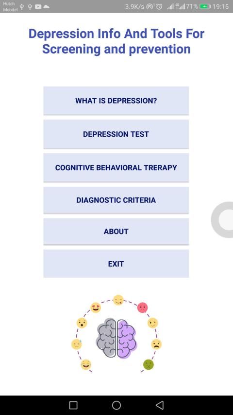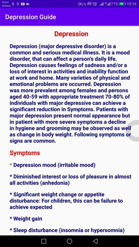 Download Depression guide to get a mental health evaluation to observe your moods and emotional feelings in your mind and avoid negative thoughts and keep positive thoughts in your mind.