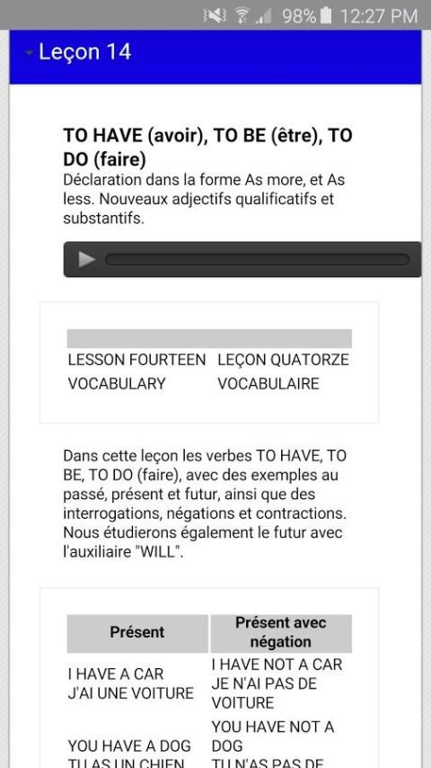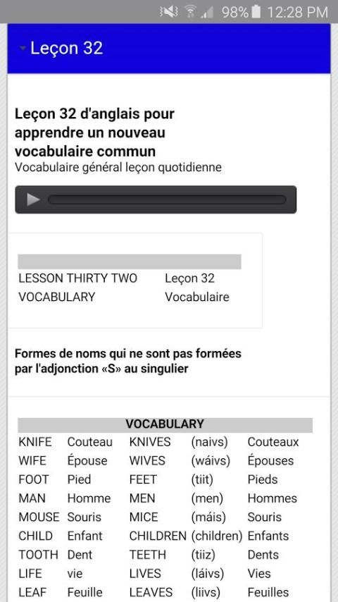 Aplikasi ini memiliki 50 pelajaran bahasa Inggris dengan audio, teks dan pengucapan Figur.