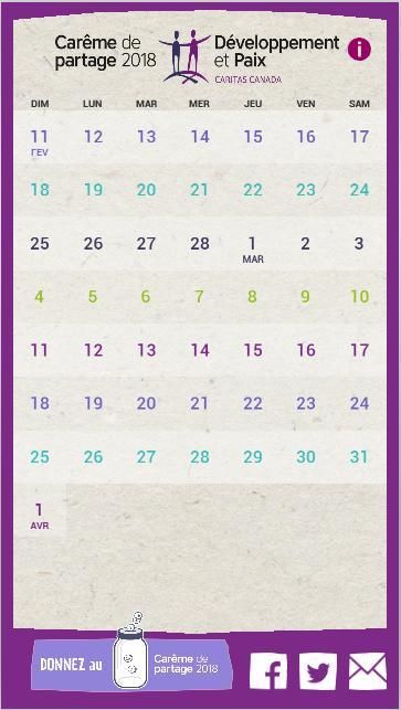 Kalender ini juga mengajak pengguna untuk memberikan sejumlah kecil uang di seluruh Prapaskah untuk membayar Pembangunan dan Perdamaian pada akhirnya.