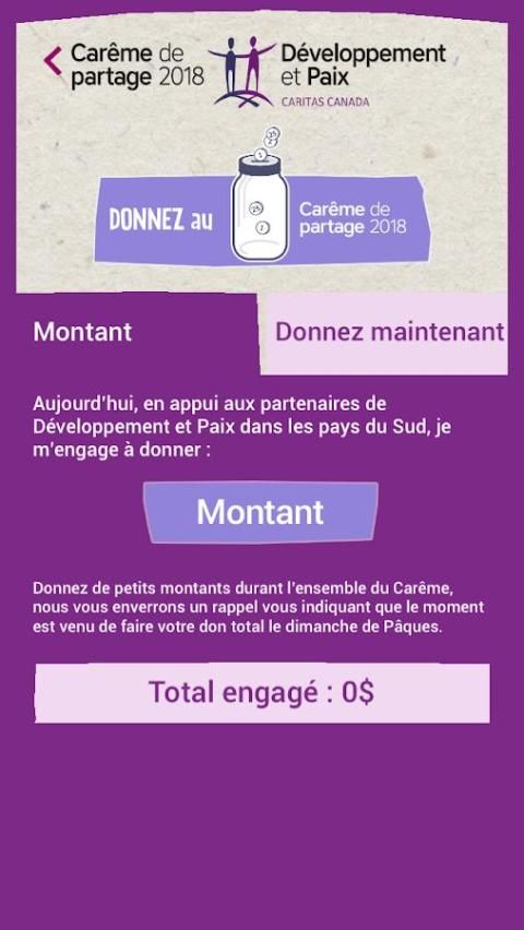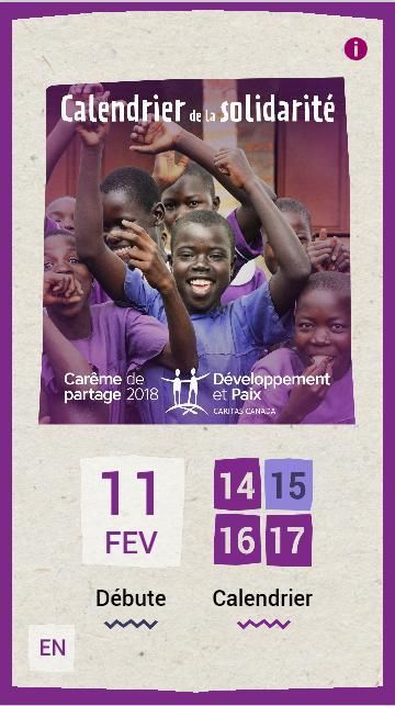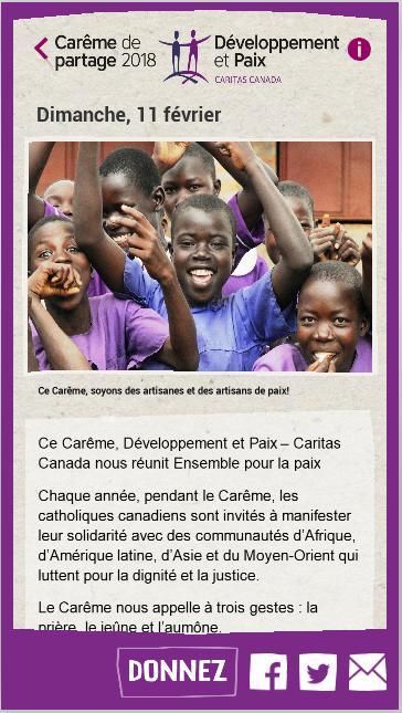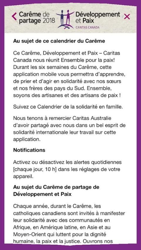 Aplikasi ini bilingual Pembangunan dan Perdamaian - Caritas Kanada adalah kalender Prapaskah yang menggunakan pendekatan belajar, berdoa dan bertindak dan membawa pengguna untuk berjalan setiap hari dalam solidaritas dengan saudara-saudari dari South kami dengan teks singkat , video atau foto.
