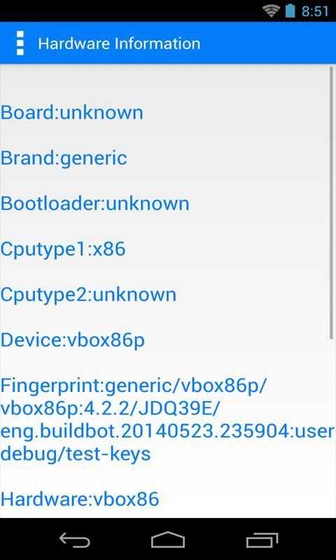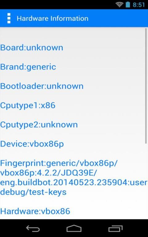Informasi ponsel android anda seperti Id, manufaktur, Model, Fingerprint, Brand, Serial, CPU, Dewan, Display, Hardware, host, Tag, Pengguna dan lebih akan tersedia untuk Anda.