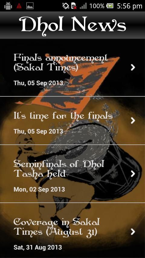 The app features list of most of such troupes who compete with their best orchestral compositions which includes Dhol, Tasha and other instruments. A real festive mood setter for everyone who hears these sounds irrespective of ethnicity and regional divergence. App is the only of its kind which features these troupes and their sounds. Dhol Tasha app also has news about the yearly competition organized in the city of Pune, Maharasthra, India by well known Sakal Publications. Inbuilt with this app are the top 10 sounds from the previous competitions.