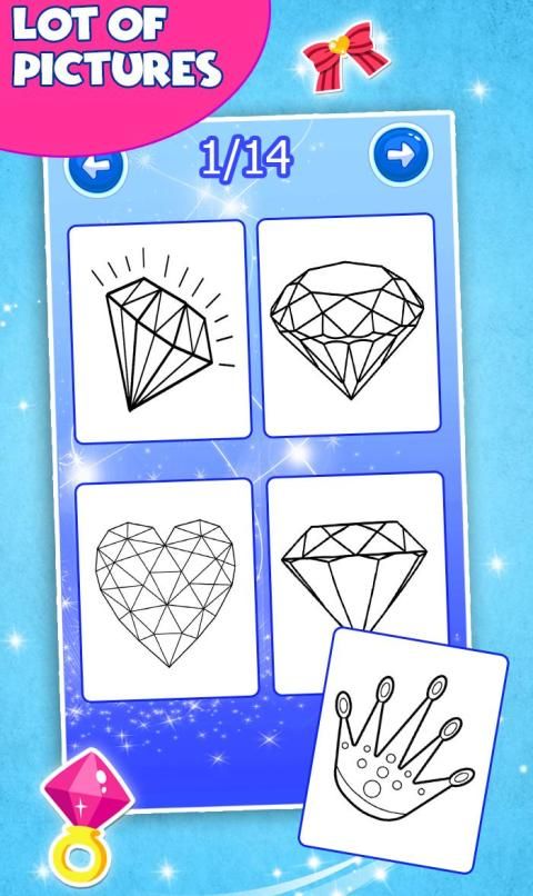 Diamond Coloring and Drawing Game memiliki +40 halaman mewarnai menakjubkan.
