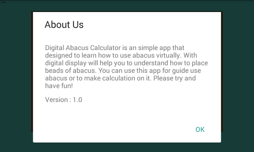 Kalkulator Sempoa Digital adalah aplikasi sederhana yang dibuat bertujuan untuk digunakan sebagai media belajar berhitung menggunakan sempoa untuk pertama kalinya. Tampilan angka digitalnya diharapkan dapat membantu bagaimana menempatkan manik-manik sempoa. Anada dapat menggunakan aplikasi sempoa ini sebagai media belajar atau untuk melakukan perhitungan.