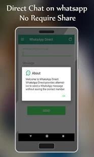 Direct Chat for WhatsApp is very easy and simple application to use, and send chat messages with WhatsApp without saving the phone number. Simply open this app and enter the destination phone number with country code then click the button then the application will be opened and you can then send message.