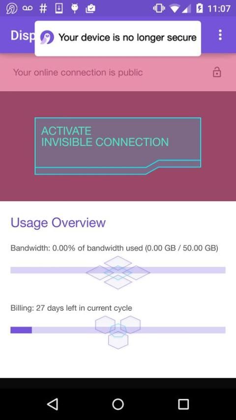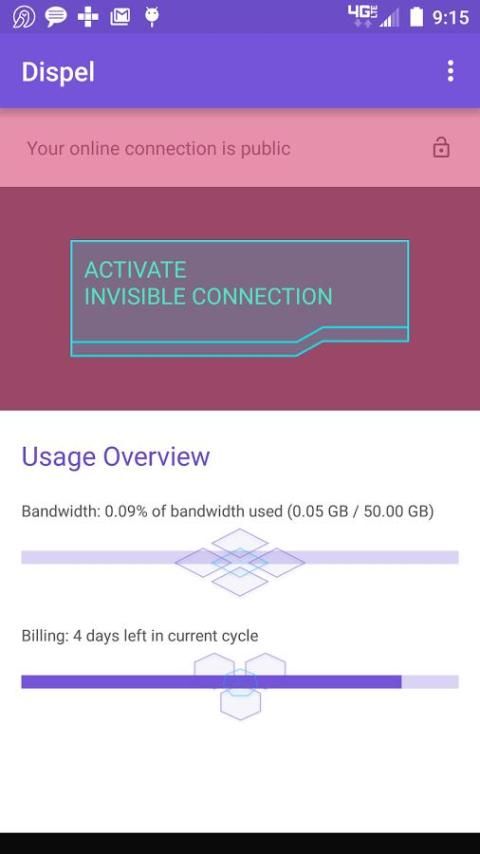 Kemudahan Penggunaan : Tidak seperti solusi privasi / anonimitas lain yang memerlukan konfigurasi yang luas, pengguna Android akan dapat mengaktifkan privasi mobile Menghilangkan ini memiliki hanya dengan menekan tombol hijau. Setelah diaktifkan, kecil, burung hantu lambang Menghilangkan akan muncul pada status bar, menandakan bahwa program ini berjalan di latar belakang.