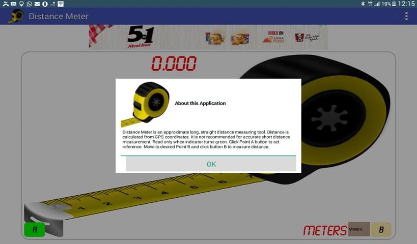 Distance Meter is an approximate long, straight distance measuring tool. Distance is calculated from GPS coordinates. It is not recommended for accurate short distance measurement. Read only when indicator turns green. Click Point A button to set reference. Move to desired Point B and click button to measure distance.