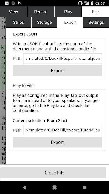 Please note that DocFill will store uncompressed audio files on your phone. Make sure that you have enough space to do so. If you wish to access the exported files, you must figure out how to copy files off your phone.