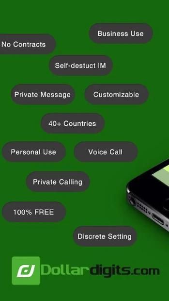Digit Dollar Memanggil App memberi Anda nomor telepon UNLIMITED pada ponsel pintar Anda. Dollar Digit nomor telepon palsu aplikasi menawarkan nomor tanpa kontrak burner untuk pemilik usaha, karyawan yang bekerja dengan komunikasi klien serta untuk pengguna sehari-hari. Dollar Digit menawarkan nomor telepon kedua cadangan yang membuat nomor pribadi atau bisnis Anda aman.