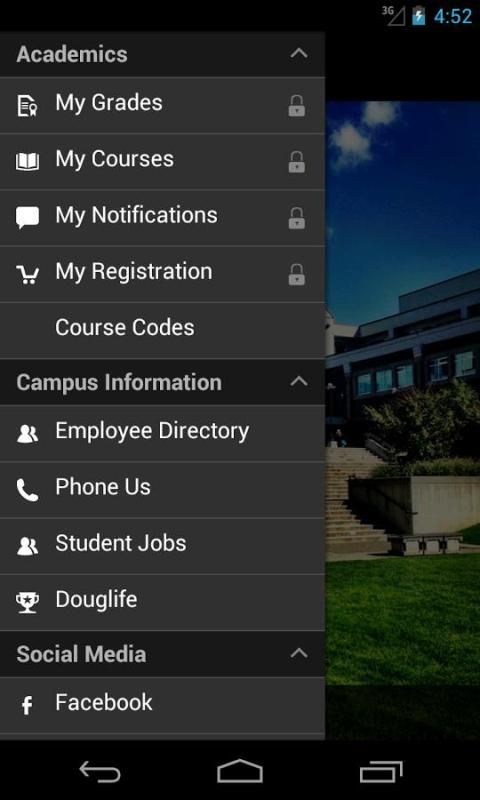 aplikasi baru Douglas College memungkinkan siswa Douglas terhubung ke sumber Perguruan Tinggi di mana saja, kapan saja. informasi akademik akses seperti nilai, jadwal, jadwal ujian dan banyak lagi, dan menerima pemberitahuan info Perguruan penting.