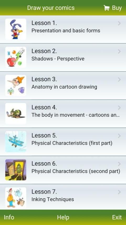 Kartunis, yang semua bekerja dengan perusahaan terkenal, akan menunjukkan cara menggambar karakter yang diinginkan mulai dari bentuk dasar semua jalan melalui ke teknik yang lebih kompleks. Untuk melihat apa yang kami maksud, tinggal download aplikasi, pelajaran pertama adalah gratis! Anda kemudian dapat membeli paket lengkap dengan harga rendah yang luar biasa.