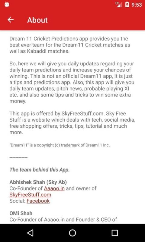 Jadi, di sini kami akan memberikan update harian mengenai prediksi tim sehari-hari Anda dan meningkatkan peluang Anda untuk menang. Ini bukan aplikasi resmi Dream11, itu hanya tips dan prediksi aplikasi. Juga, aplikasi ini akan memberikan update harian tim, berita lapangan, kemungkinan bermain XI dll dan juga beberapa tips dan trik untuk memenangkan beberapa uang ekstra.