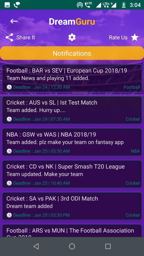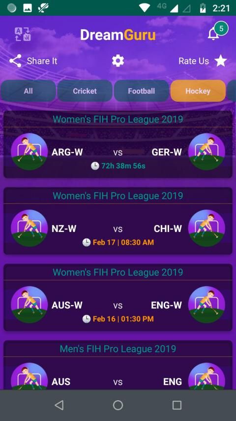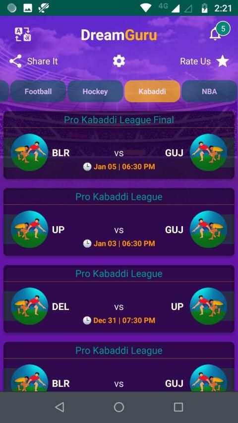 Dream Guru adalah salah satu aplikasi terbaik untuk Pertandingan Fantasi untuk Cricket, Football, Kabaddi, NBA dan Hockey. Pakar Dream Guru kami menyediakan Jadwal Pertandingan, Berita Tim dan Analisis, Pasukan Lengkap, Bermain11, dan Tim Impian Terprediksi setelah analisis detail.