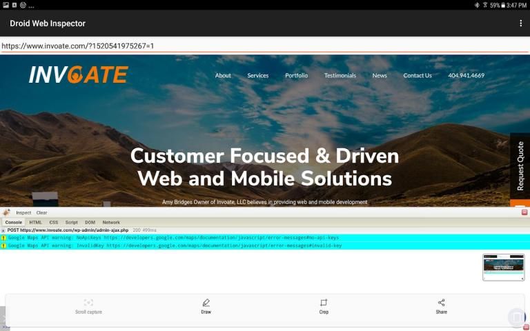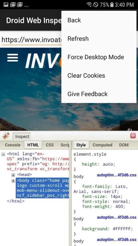 Droid Web Inspektur untuk Telepon Android dan tablet akan memungkinkan Anda untuk menghibur log debug dan mengedit hidup ke website html / css melalui perangkat Anda tanpa perlu untuk remote debugging. Droid Web Inspektur menggunakan versi kustom Firebug Lite yang telah dioptimalkan untuk dukungan sentuh pada perangkat mobile.