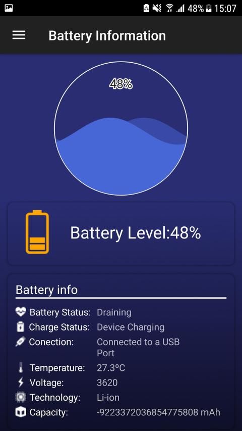 "Info Baterai" menunjukkan arus pengisian / pemakaian baterai dan juga memberikan informasi tentang kesehatan, tegangan, dan suhu baterai.