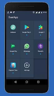 Sebagai salah satu alat top-peringkat di Android, DualApp (Paralel App) membantu Anda log on beberapa account pada waktu yang sama pada satu device.It berjalan lebih cepat dan lebih stabil daripada Angkasa Paralel. Selain itu, Clone App kompatibel dengan sebagian besar Android apps.Finally, Ini GRATIS selamanya. Dan itu sangat cepat.
