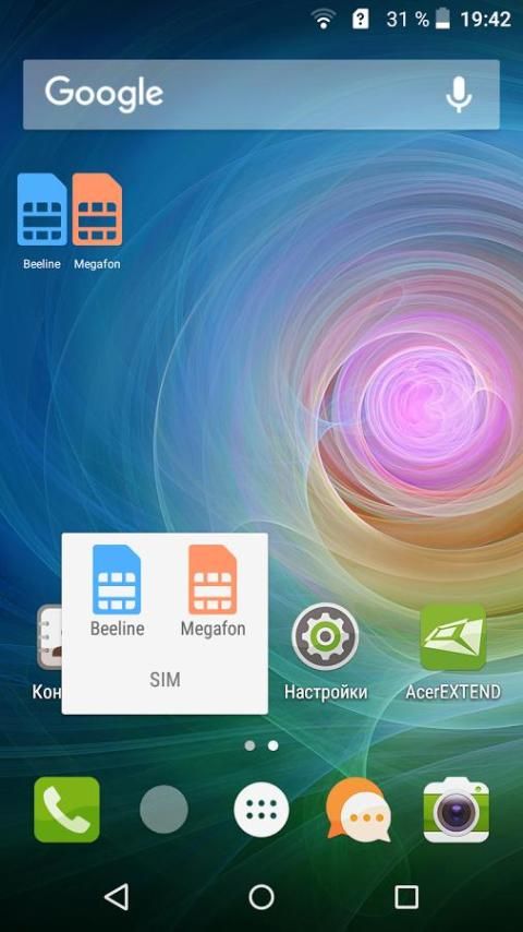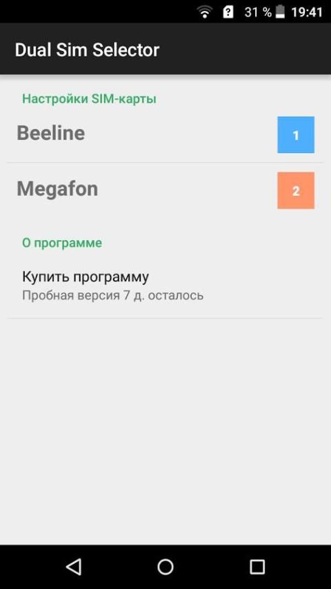 Aplikasi fungsional sangat sederhana: Anda perlu menambahkan widget, atau membuat ikon untuk SIM-card. Untuk membuat panggilan, klik pada widget untuk SIM-card yang diinginkan, dan secara otomatis akan membuka satu set angka atau daftar kontak, dan panggilan berikutnya akan pergi ke SIM-card yang dipilih.