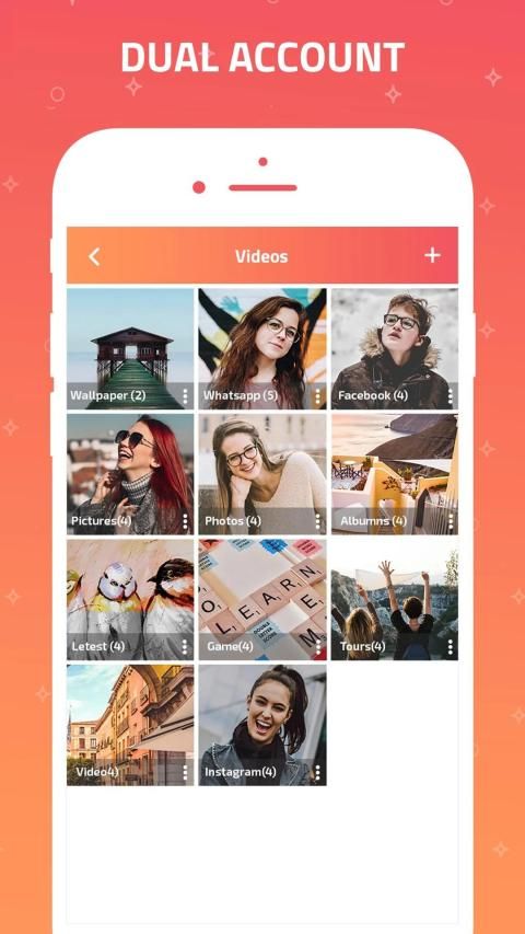 Aplikasi ganda: beberapa akun aplikasi yang sangat user-friendly. Cukup buka aplikasi dan pilih aplikasi yang ingin Anda jalankan dengan banyak akun dan nikmati clone untuk aplikasi itu.