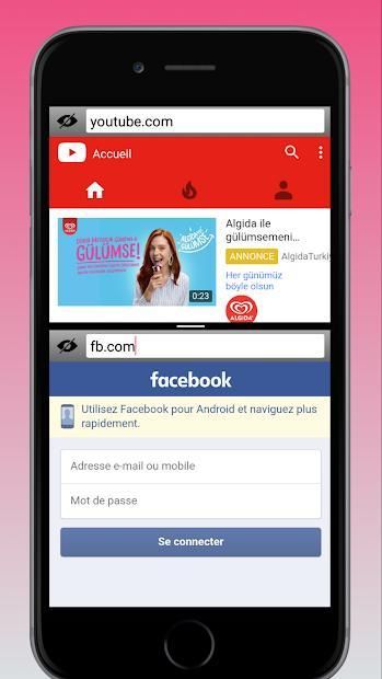 Browser web ringan dengan dua tab dalam satu tampilan. Anda dapat memiliki dua situs web terpisah yang terbuka dan ditampilkan secara bersamaan di layar. Mainkan video di tab pertama saat membaca berita pada tab kedua, kunjungi akun media sosial Anda atau mainkan game online sambil membaca buku atau apa pun.