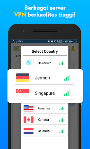Duck Go VPN adalah aplikasi VPN Android super aman dan terbaik di dunia dengan beragam pilihan server VPN berkualitas tinggi, banyak server yang lebih cepat dan lebih aman untuk dipilih.