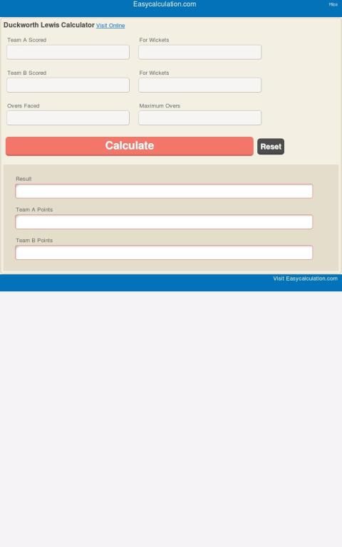 Cari hasil pertandingan dengan kalkulator ini menggunakan skor, wickets dan overs dihadapi oleh kedua tim.