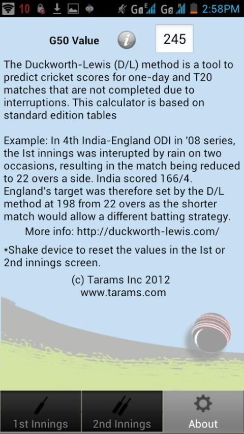 Dalam olahraga kriket, metode Duckworth-Lewis (D / L Metode) merupakan formulasi matematika yang dirancang untuk menghitung target skor untuk tim kriket dalam satu hari dan Twenty20 pertandingan kriket terganggu oleh cuaca atau keadaan lainnya. Aplikasi ini bagus menghitung skor direvisi dalam situasi seperti dengan menggunakan Edition D / L tabel Standar. Anda dapat menggunakan aplikasi ini dalam permainan klub lokal Anda serta sambil menonton kriket internasional di televisi.