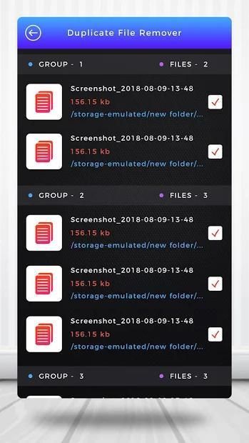 Setelah memindai, file duplikat dikategorikan dalam kelompok agar mudah dilihat, memungkinkan Anda untuk dengan mudah menghapus yang tidak Anda perlukan. Cukup gulir ke bawah untuk melihat semua grup dan hapus dengan memilihnya.