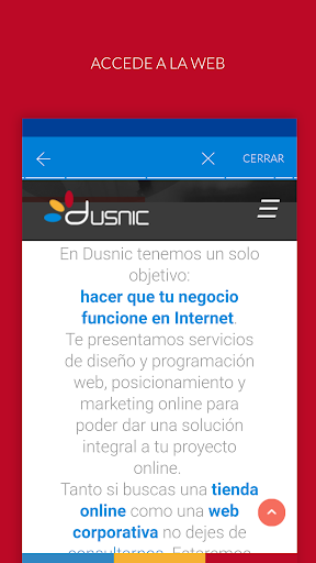Aplikasi dusnic memungkinkan Anda untuk kontak dengan kami dengan cepat: Anda dapat menghubungi kami dan mengirimkan tiket kami dalam beberapa detik.Anda juga akan memiliki akses langsung ke situs web kami, memeriksa proyek yang telah kami buat dan meminta anggaran jika Anda menyukai apa yang Anda lihat.Jika Anda ingin menemukan kami, aplikasi ini mencakup lokasi kami.