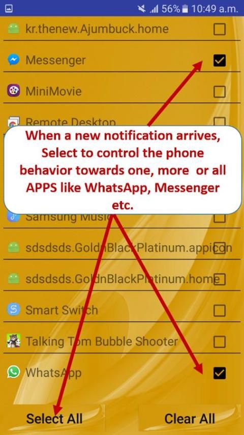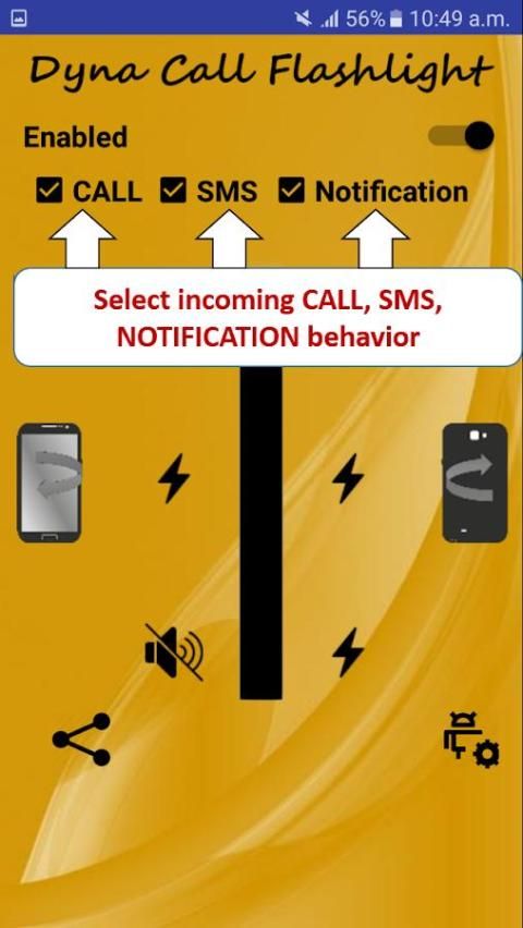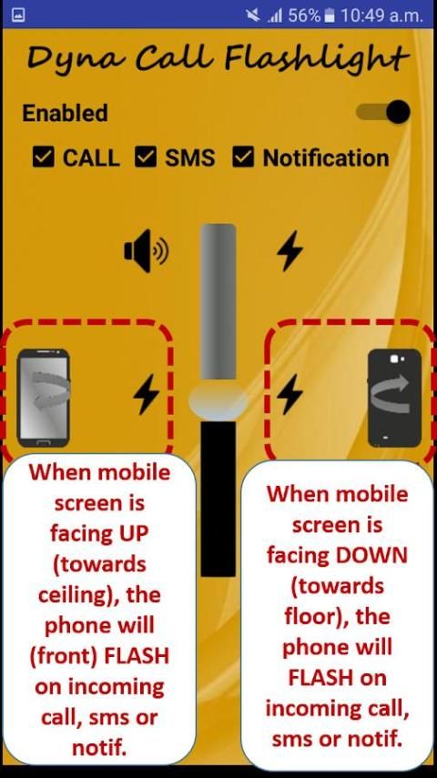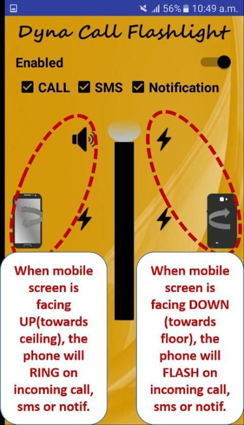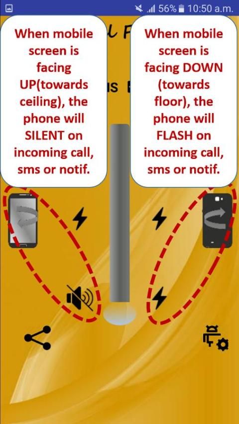Sebuah aplikasi terobosan yang benar yang ‘cerdas’ menyesuaikan dengan kebutuhan pengguna. Aplikasi ini menentukan apakah ponsel sedang menghadapi ‘UP’ atau ‘BAWAH’ dan sesuai berkedip, bergetar atau tinggal bisu. Aplikasi ini dilengkapi untuk menggunakan depan dan belakang senter kamera. Membuat pilihan dan aplikasi ingat itu dan berjalan di latar belakang. Ini menangani pemberitahuan seperti Facebook, WhatsApp, twitter dll