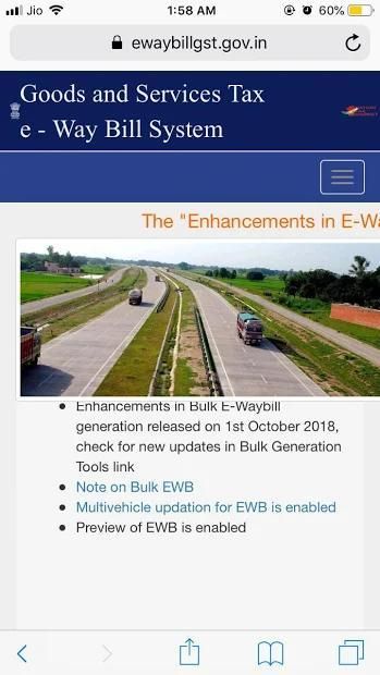 Sesuai dengan pembaruan pada tanggal 23 Maret 2018, Generasi dari RUU E-Way telah dibuat wajib dari tanggal 1 April 2018. Penerapan e-way antar negara bagian diberitahukan untuk diimplementasikan mulai tanggal 1 April 2018.